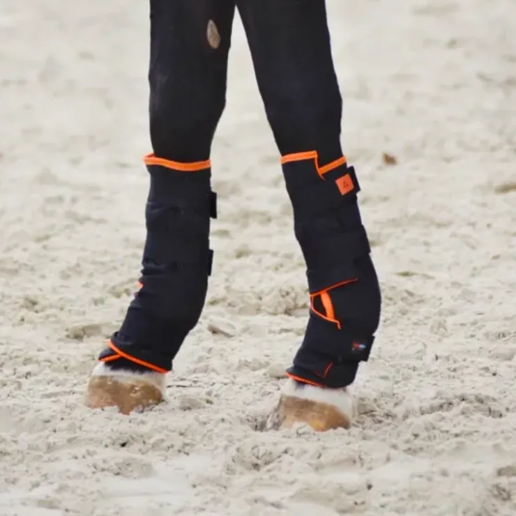 – Laissez les guêtres jusqu’à 30 minutes par séance sur les membres de votre cheval, appuyez fermement pour assurer une application correcte et assurez-vous de bien attacher chaque guêtre pour que celle-ci ne glisse pas ou ne soit pas trop serrée.