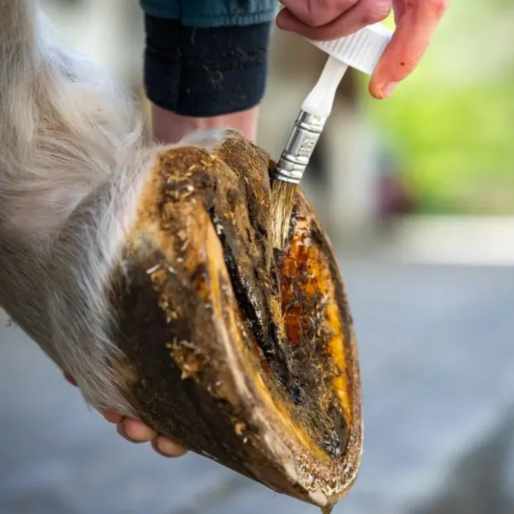 Nettoyer le sabot. Appliquer l’huile à l’aide du pinceau sur l’ensemble du sabot. Bien insister au niveau du périople. À utiliser quotidiennement jusqu’à amélioration, puis espacer les applications tous les 2 à 3 jours.