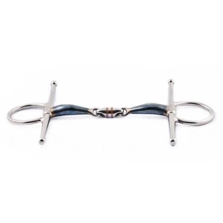 Mors Aiguiles, canon de 16 mm en Blue Steel. L’alliage Blue Steel qui recouvre cette gamme de mors Jump’In est composé de 54% de carbone et 46% de manganèse. Les mors Blue Steel s’oxydent au contact de l’air et de l’humidité. Il apparaît alors une fine couche de rouille au goût sucré qui stimule naturellement la production de salive. En salivant plus, le cheval prend plus de contact sur son mors. Dans ce processus d’oxydation la couleur va changer en gris/brun.