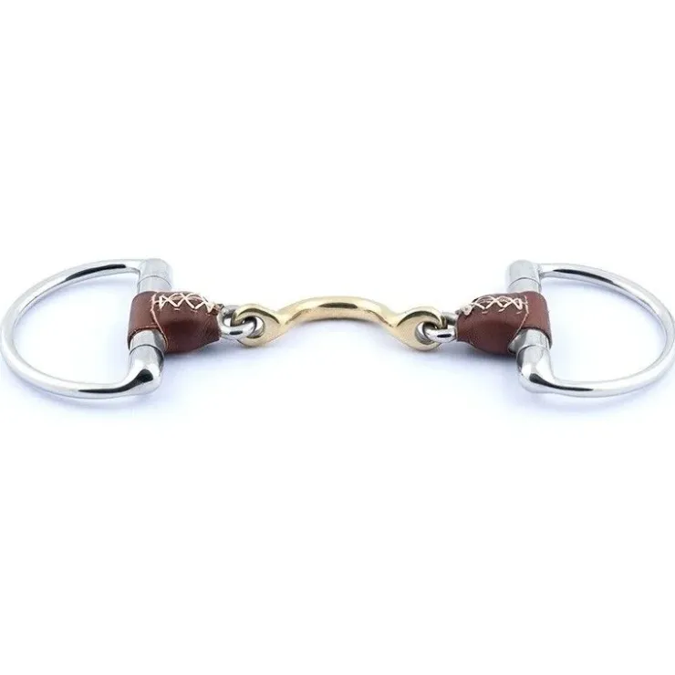 Mors à Olives à anneaux de 70 mm, canon large de 20 mm en Inox gainé de cuir et double brisure avec passage de langue en German Silver (65% cuivre, 23% zinc, 12% nickel, un alliage décontractant et solide). Les mors Jump’In composés de cuir sont très doux et confortables pour le cheval. Contrairement à l’Inox, le Sweet Iron ou à d’autres alliages, le cuir évite un contact trop froid.