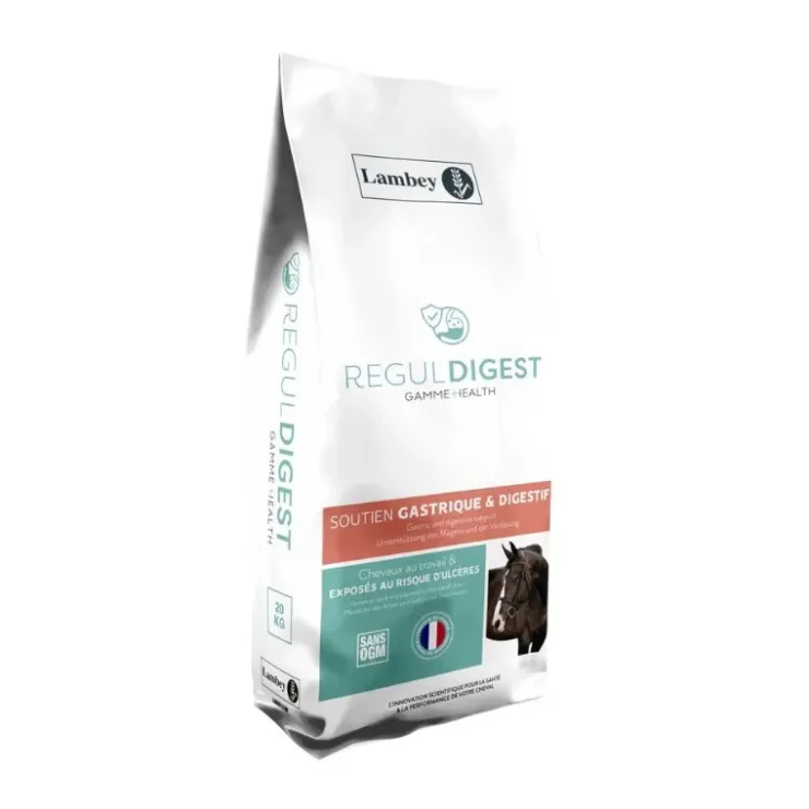 Le Floconné Cheval Lambey Regul Digest s’utilise en complément du fourrage. Nous recommandons une distribution minimum de foin à raison de 1 kg pour 100 kg de poids vif. Soit une distribution de 5 kg par jour pour un cheval de 500 kg.