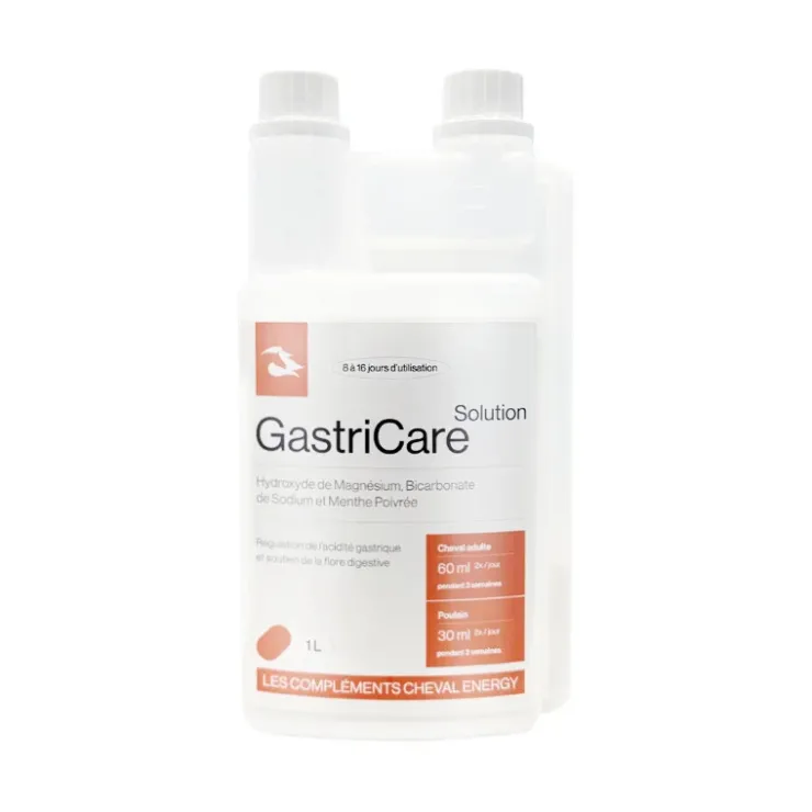 GastriCare Solution de Cheval Energy est un complément alimentaire spécialement formulé pour les chevaux présentant des signes d’excès d’acidité stomacale, comme le tic à l’air, le tic à l’appui, le tisage ou la perte d’appétit. Sa formule à base de magnésium et bicarbonate aide à rétablir l’équilibre gastrique naturel.