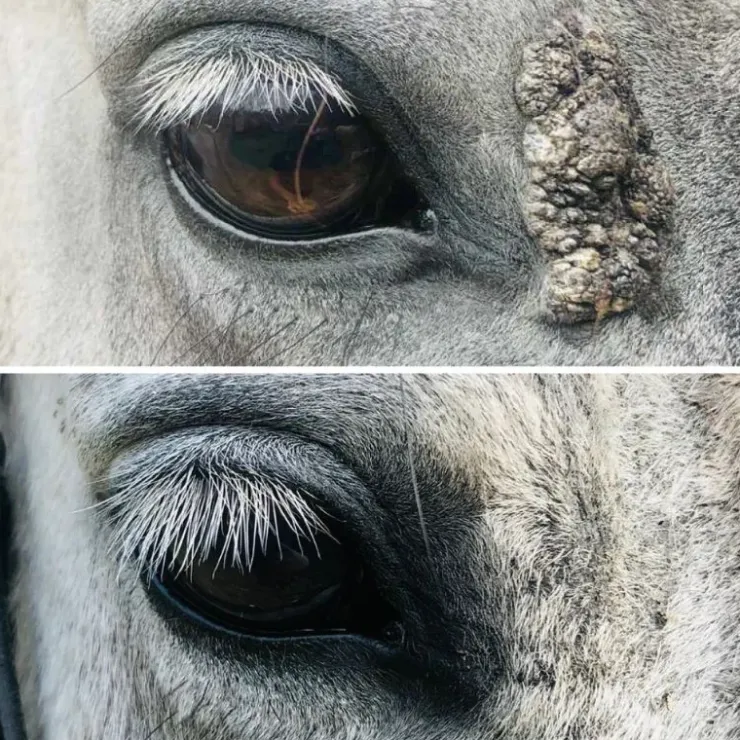 Les ingrédients tels que l’huile végétale de pépins de Raisin, le macérat huileux de Calendula et les huiles essentielles de Tea tree, de Citron, de clou de Girofle et de Cannelle ont tous des propriétés bénéfiques pour aider à traiter les verrues, les sarcoïdes et l’hyperkératose chez les chevaux.