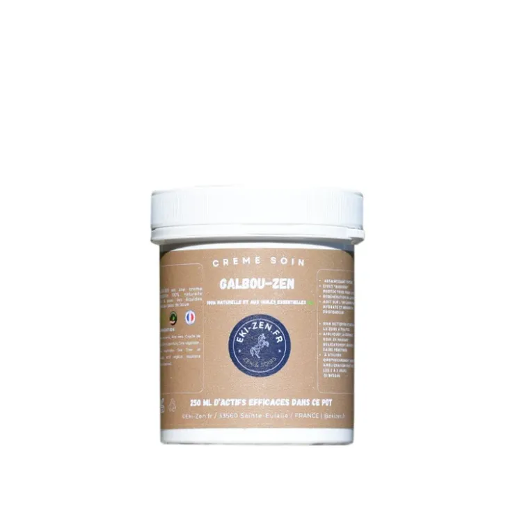 Galbou-Zen er Eki-Zen est un baume de soin naturel spécialement formulé pour traiter les peaux abîmées et lésées du cheval. Sa composition unique associe beurre de karité, aloe vera, oxyde de zinc et huiles essentielles bio pour favoriser la réparation cutanée en cas de gale de boue, crevasses, dermatophilose et photosensibilité.