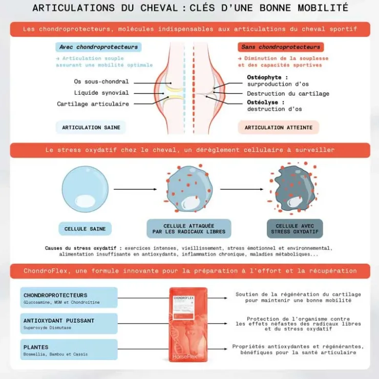 ChondroFlex de HorseFlex Care représente l’aboutissement d’une recherche approfondie en nutrition équine articulaire. Sa formulation unique combine des chondroprotecteurs scientifiquement reconnus et des extraits végétaux aux propriétés naturelles. Cette synergie d’ingrédients de haute qualité offre une approche complète du soutien articulaire, ciblant simultanément la structure cartilagineuse, la qualité du liquide synovial et le confort global du système locomoteur.