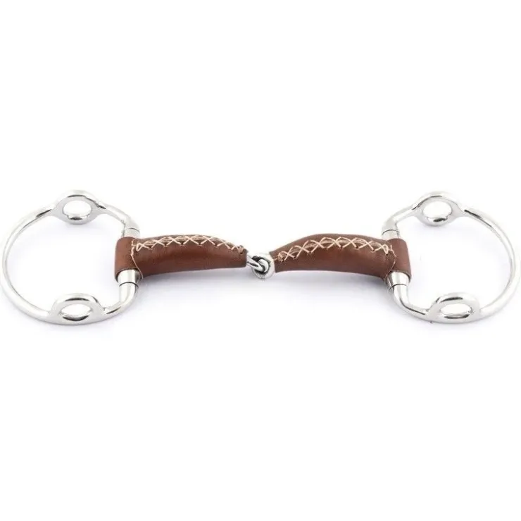 Mors Releveur à anneaux 75 mm, canon large de 20 mm en Inox gainé de cuir et double brisure en German Silver (65% cuivre, 23% zinc, 12% nickel, un alliage décontractant et solide). Les mors Jump’In composés de cuir sont très doux et confortables pour le cheval. Contrairement à l’Inox, le Sweet Iron ou à d’autres alliages, le cuir évite un contact trop froid.